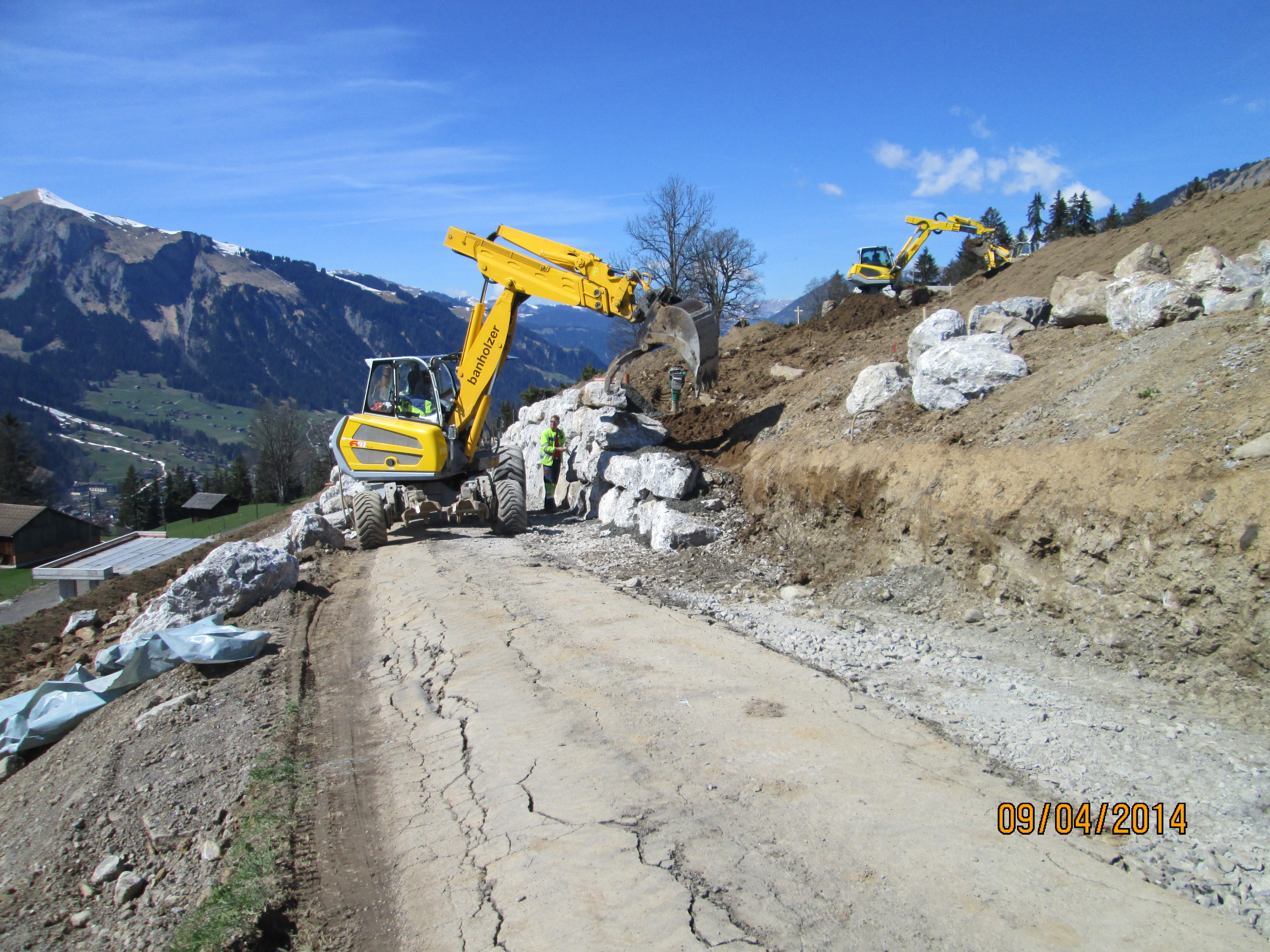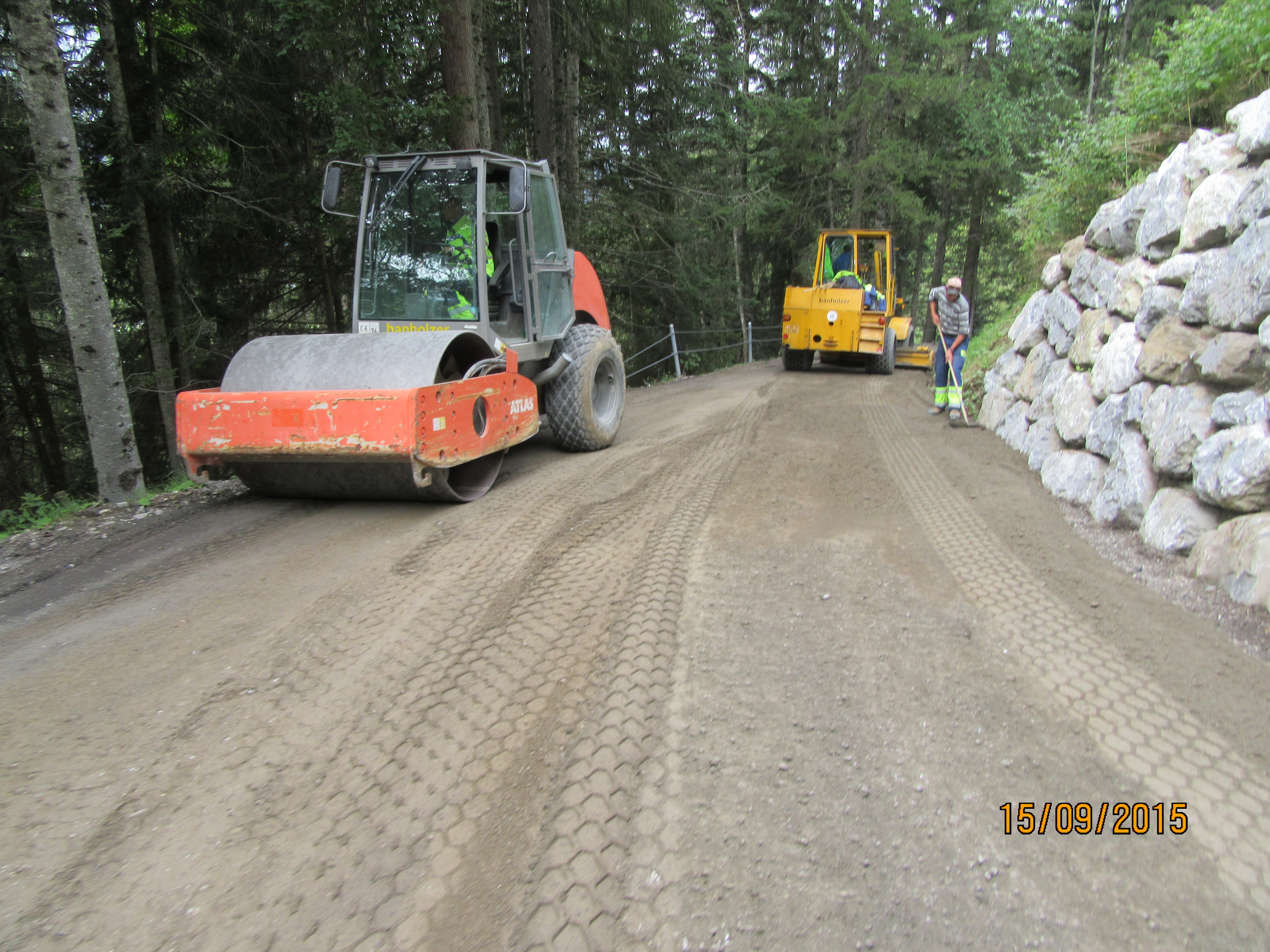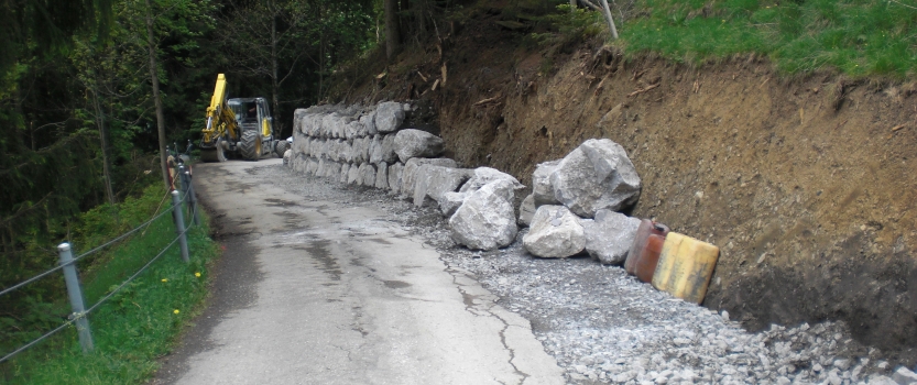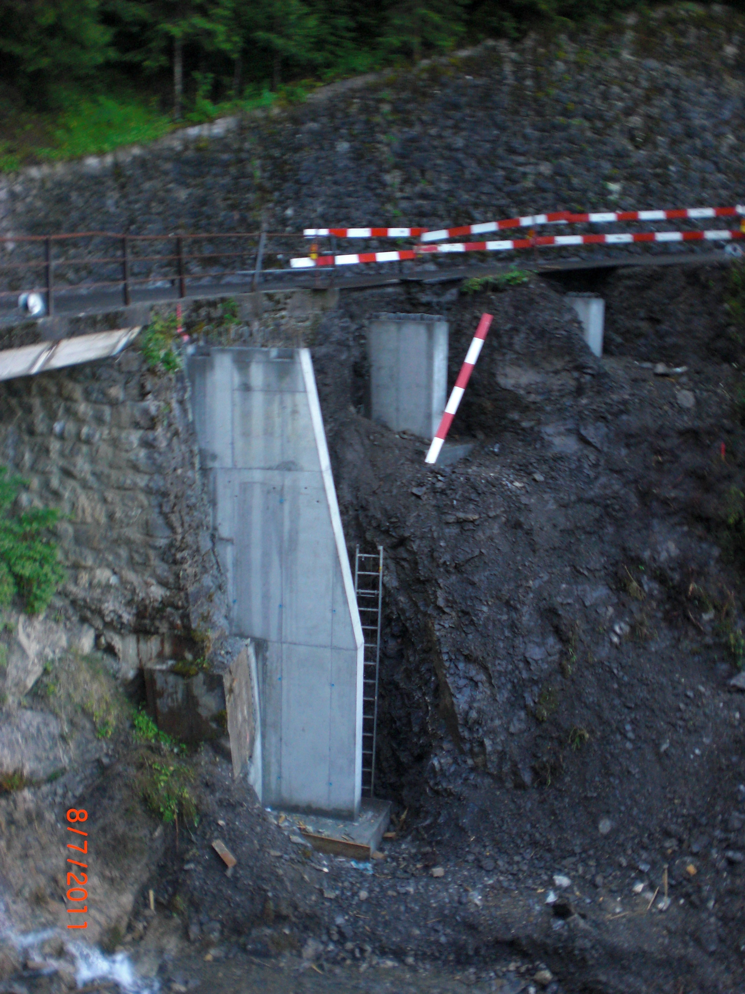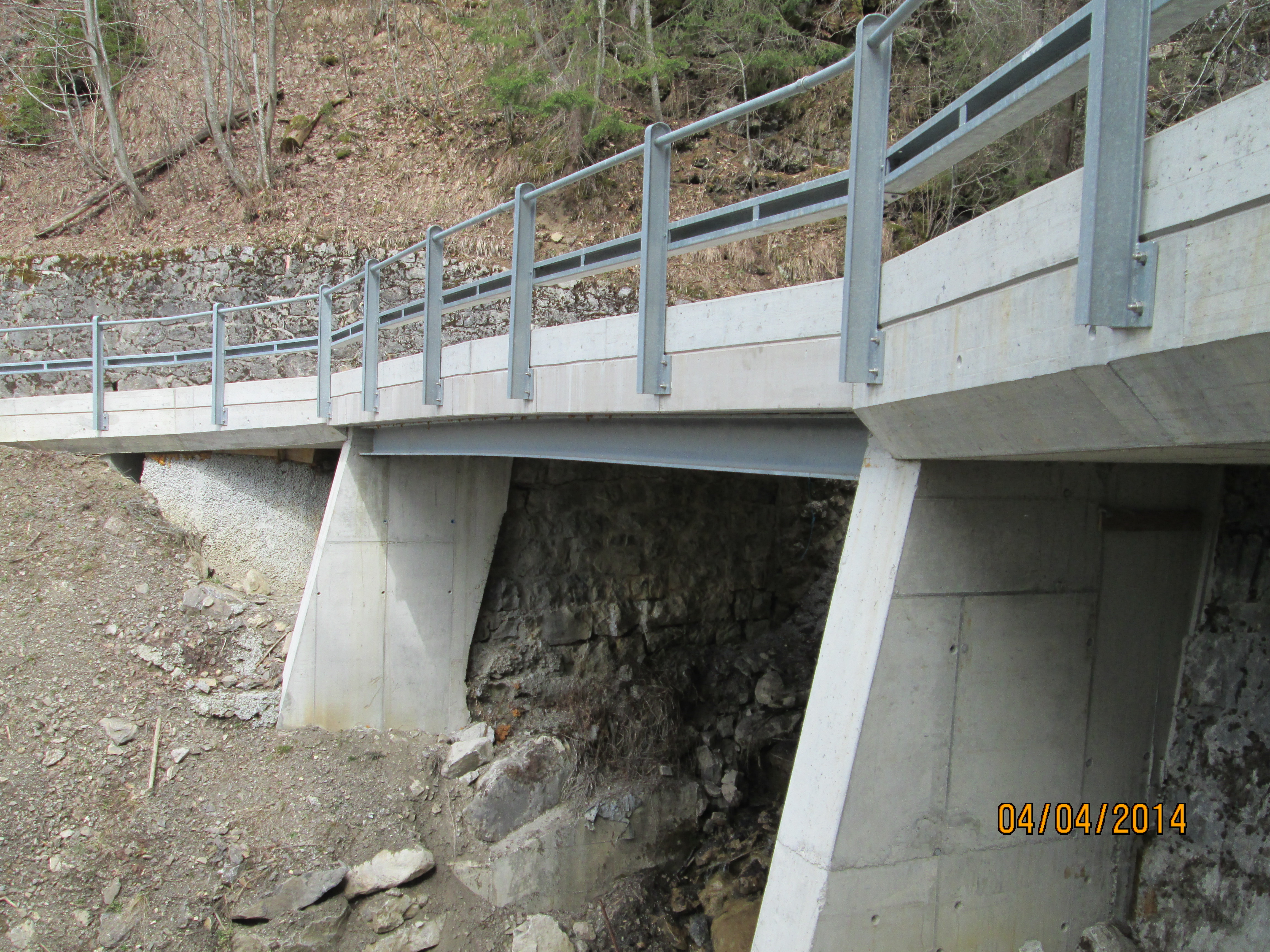 Ausbau der best. Strasse. Berg- und talseitige Hangsicherungen, Strassen- und Brückenverbreiterungen sowie Sanierung des Oberbaus.